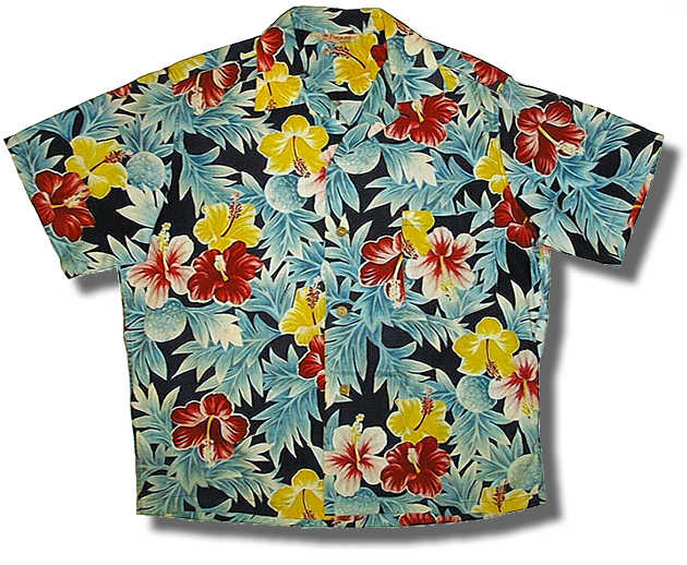 A colorful Pikaki print from the 50s. The five color print is more commonly found on the rayon shirts.