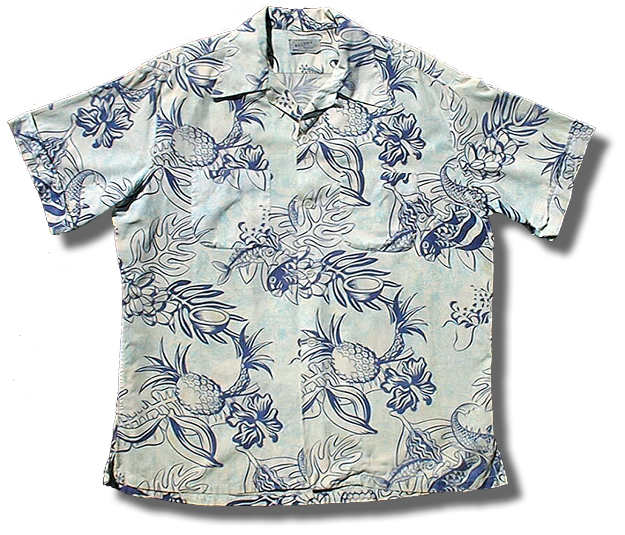 One measure of the quality of a fish print is by the size of the fish's lips. This is an excellent novelty print with background images of a luau in light blue.