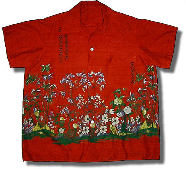 This is an unusual border print of a garden scene with japanese characters printed across the top. The buttons are mother of pearl.
