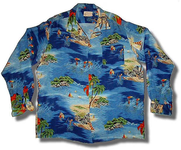 I've always loved long-sleeved Hawaiian shirts. Back in 50s they were actually created to be worn as a more formal attire. This one is a Royal Hawaiian on crepe de chine rayon.